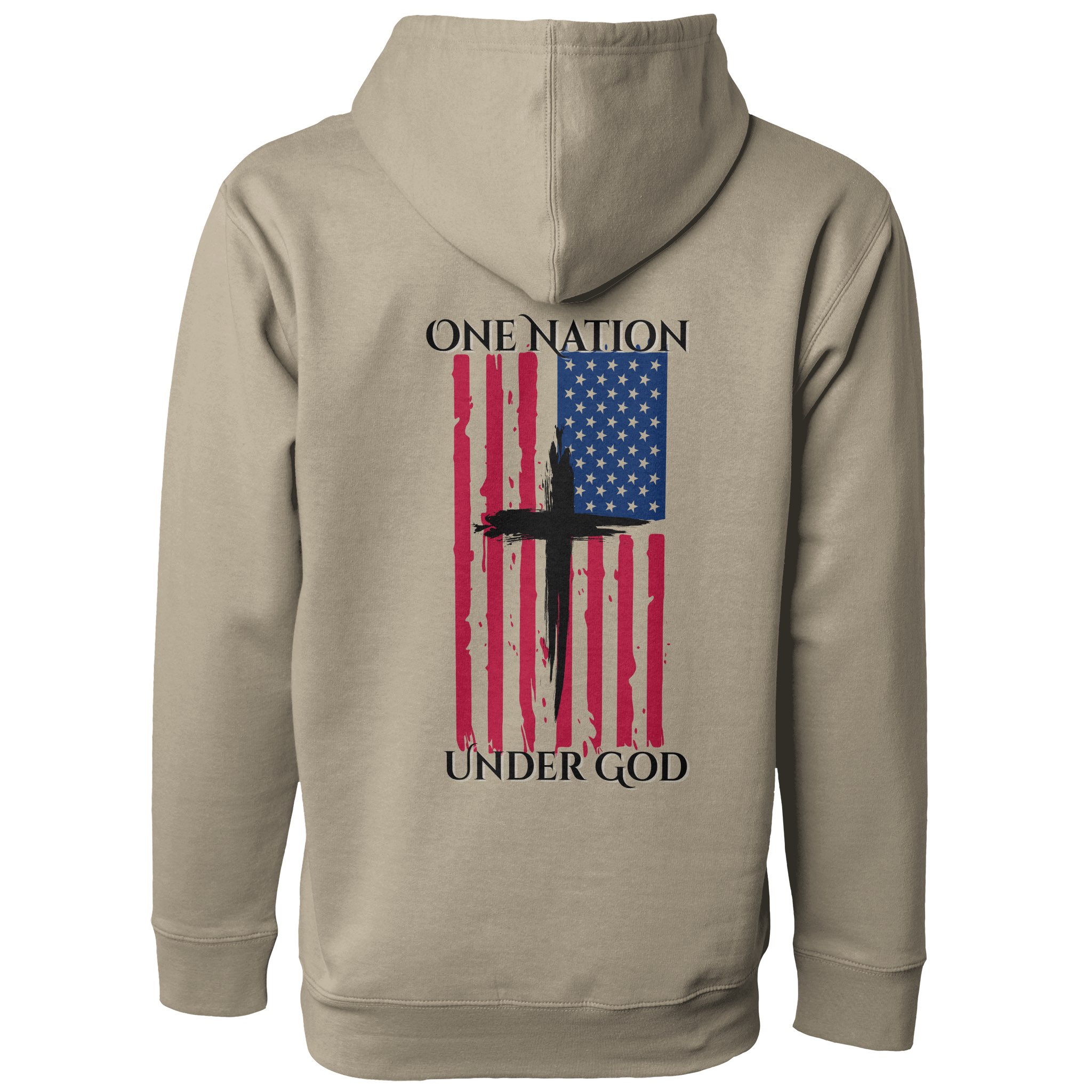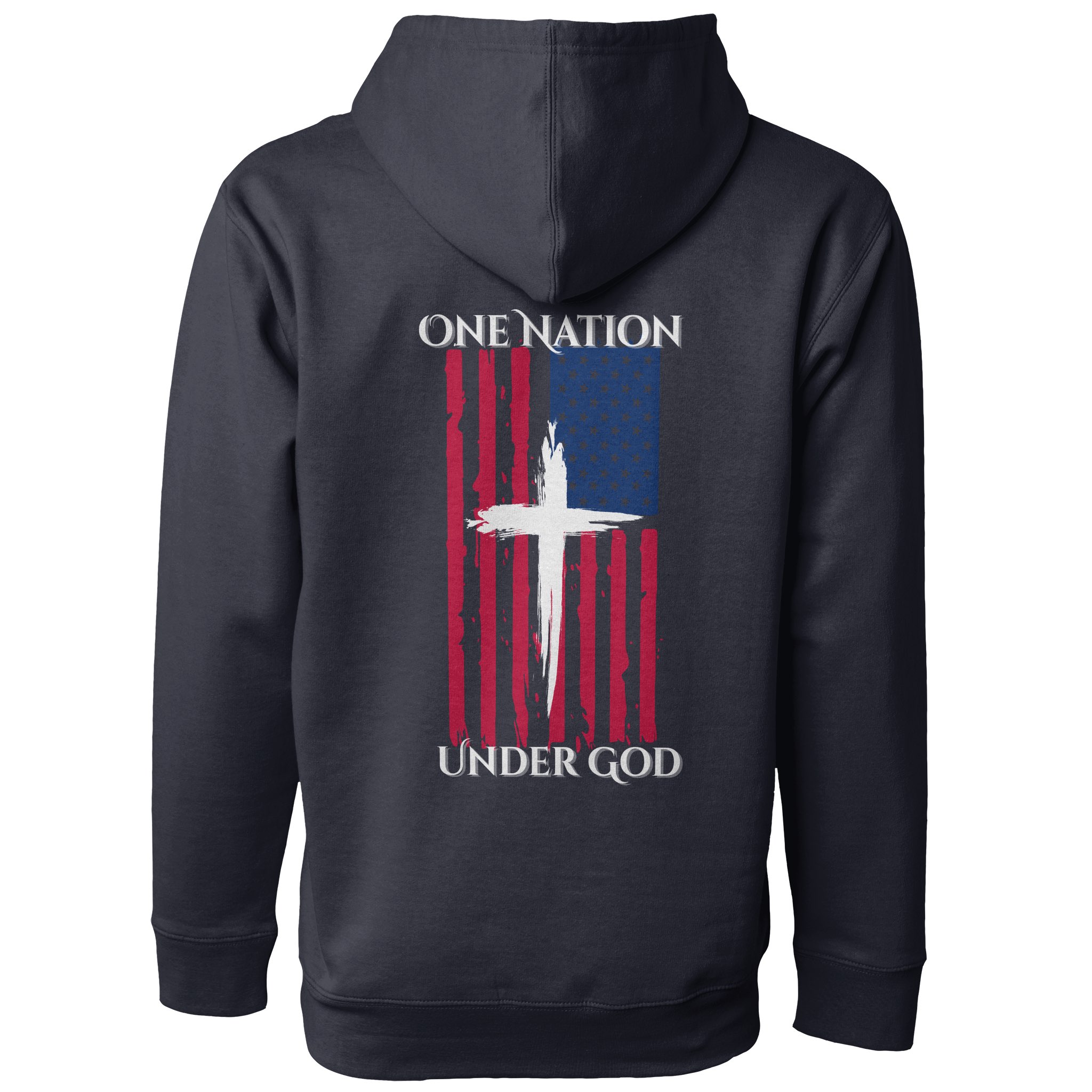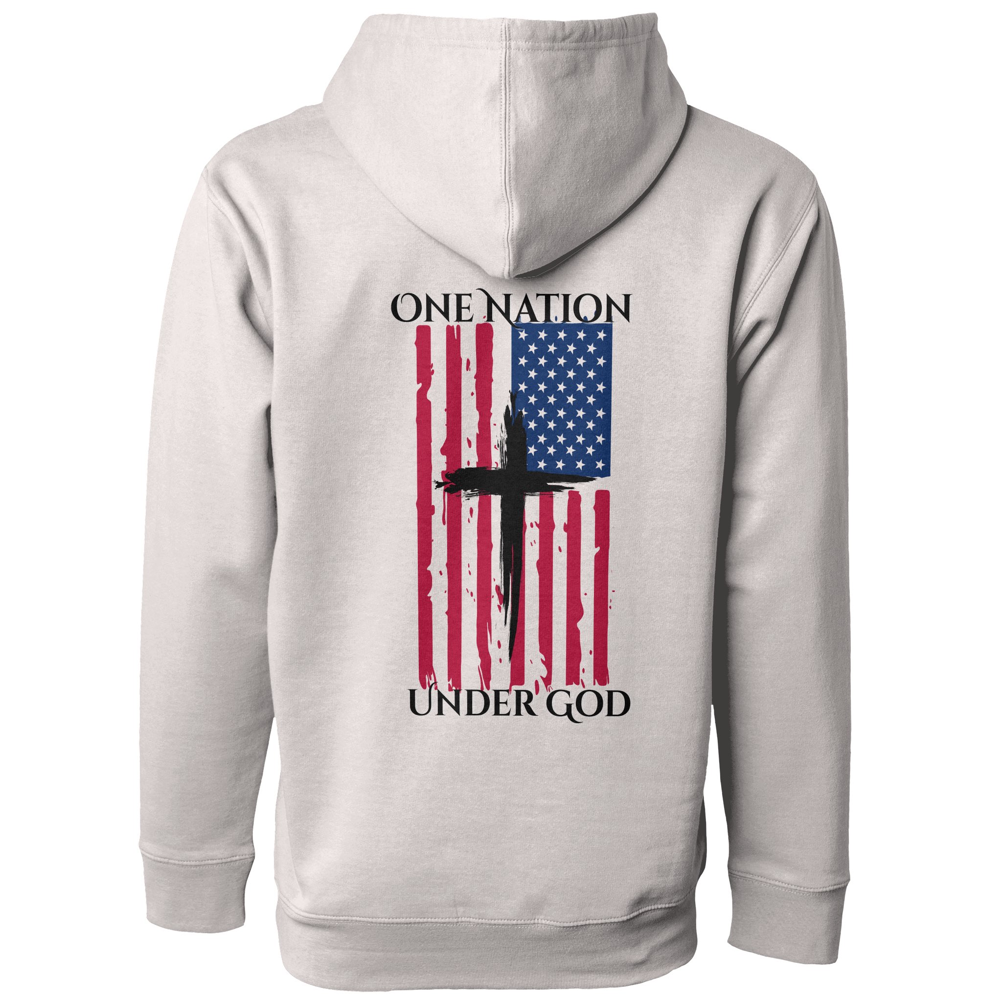 Show your faith and patriotism in one powerful piece with the One Nation Under God Sweatshirt, crafted from a soft and durable 80/20 cotton-poly blend. The back features a bold, distressed American flag merged with a striking white cross and the words “One Nation Under God,” creating a design that stands out with meaning. On the front, the clean Trust in God cross adds a simple but powerful reminder of where strength and peace come from.
