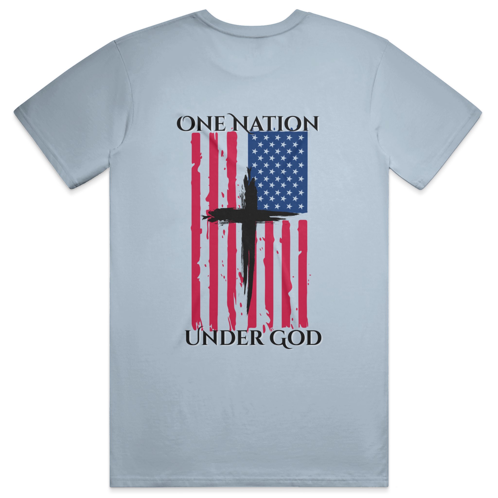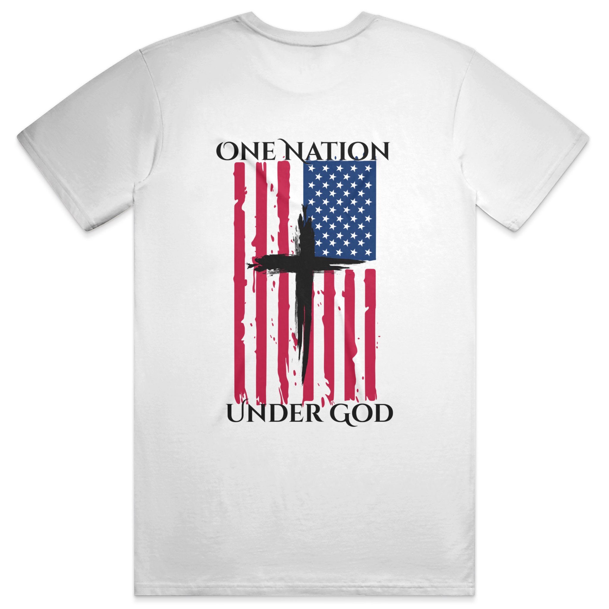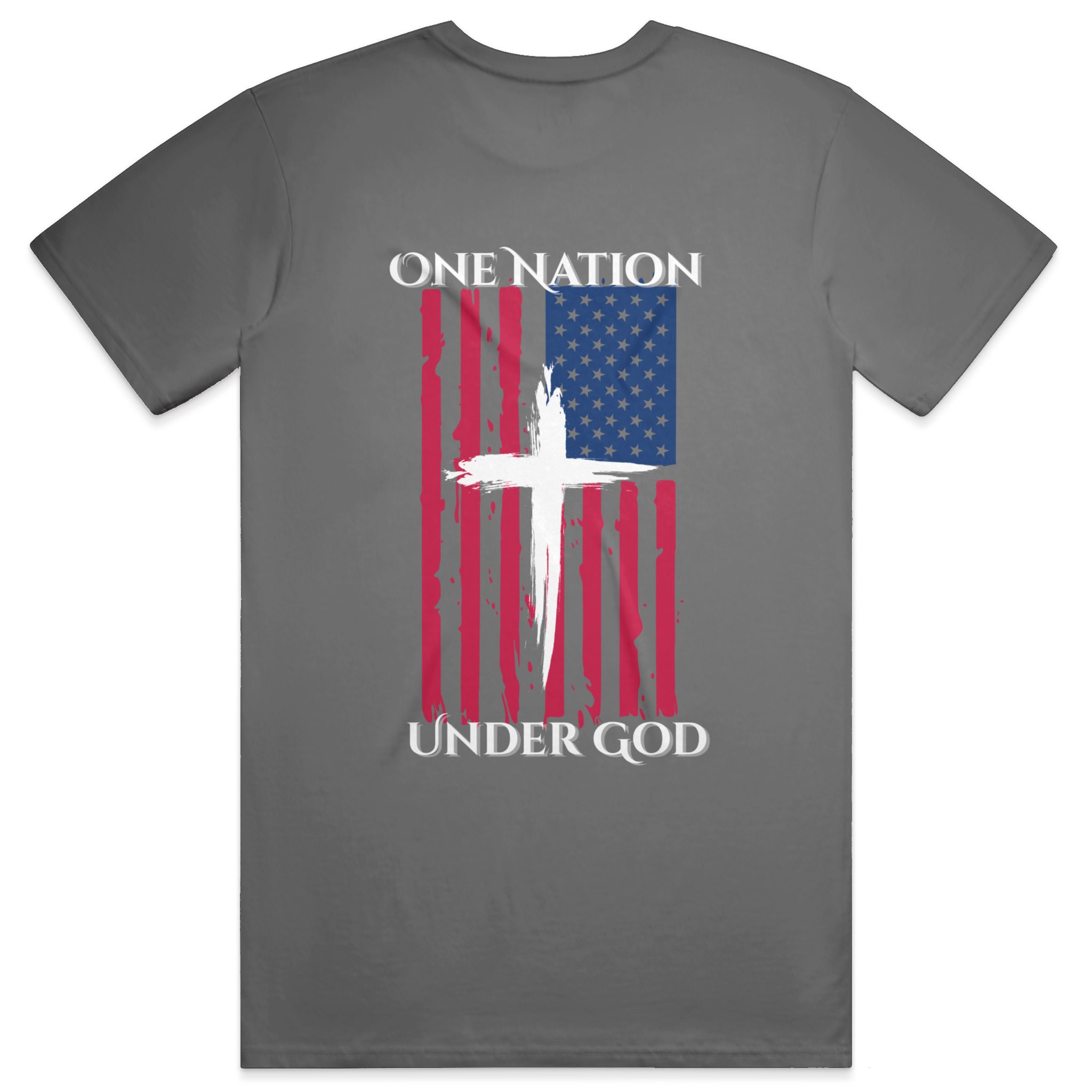 The back features a powerful image of the American flag blended with a white cross and the words “One Nation Under God” — a striking reminder of unity, faith, and freedom. On the front, a simple cross paired with the words “Trust in God” completes the message of devotion and strength.