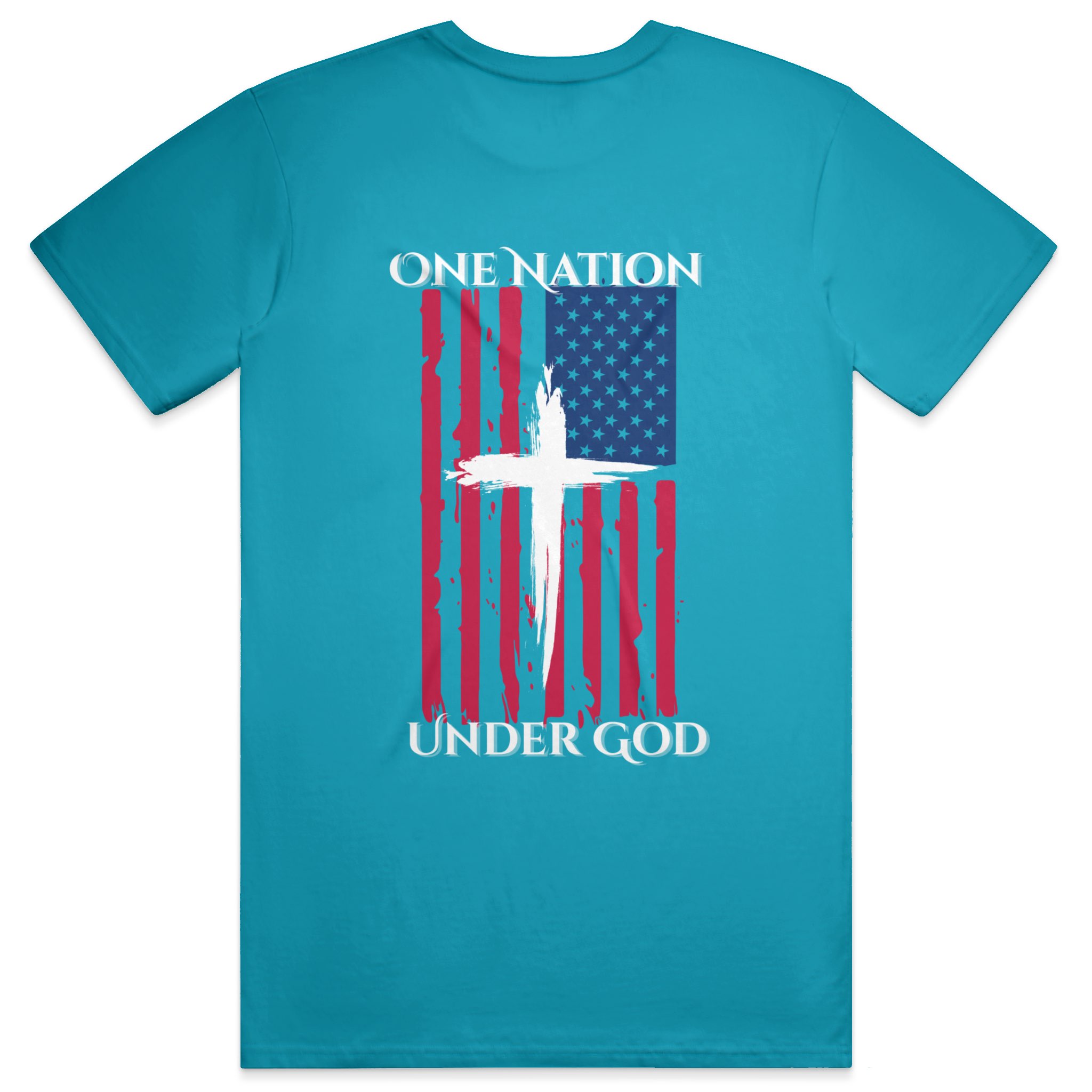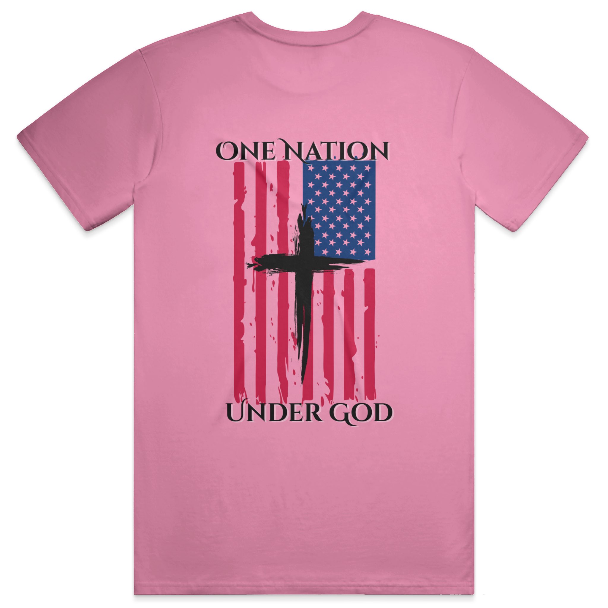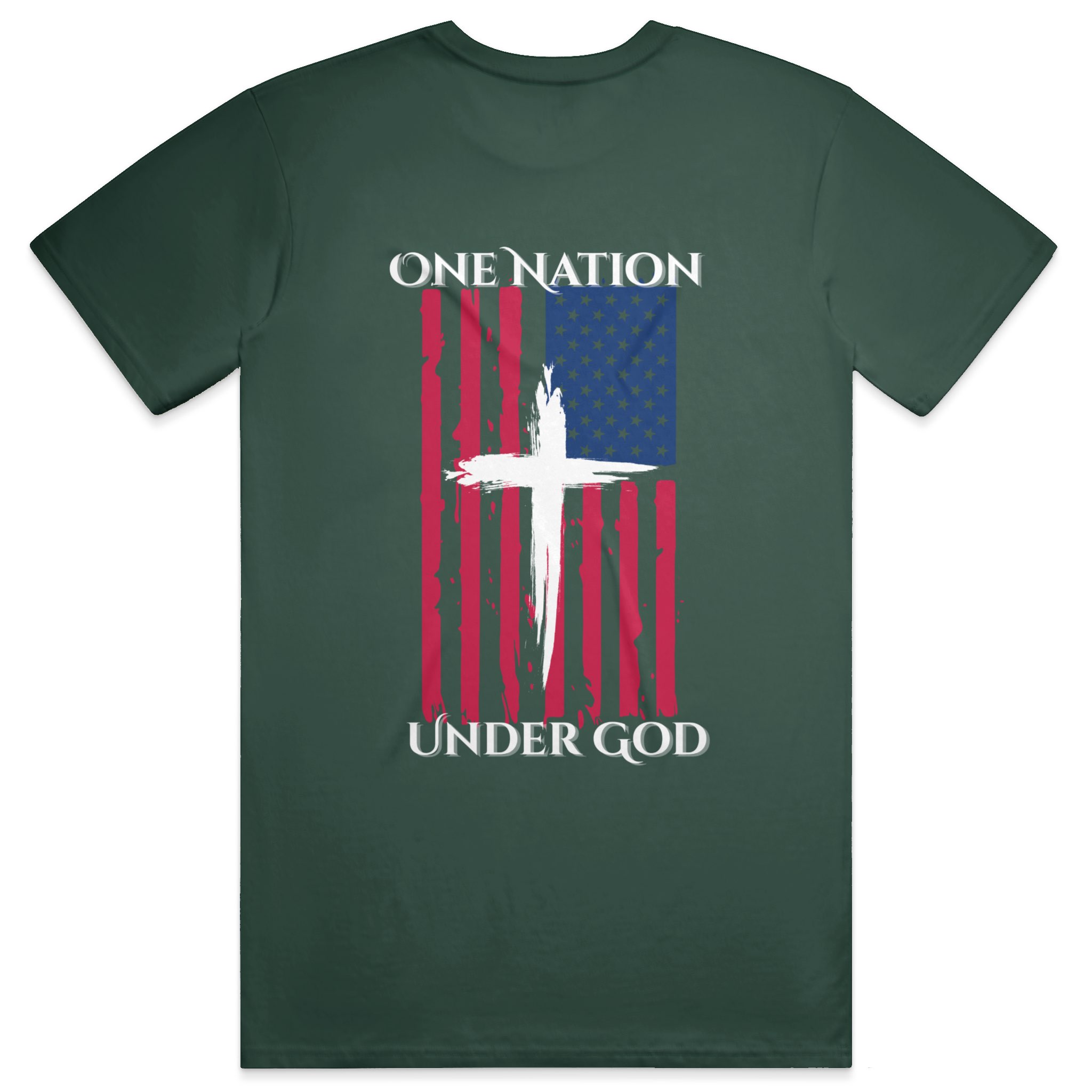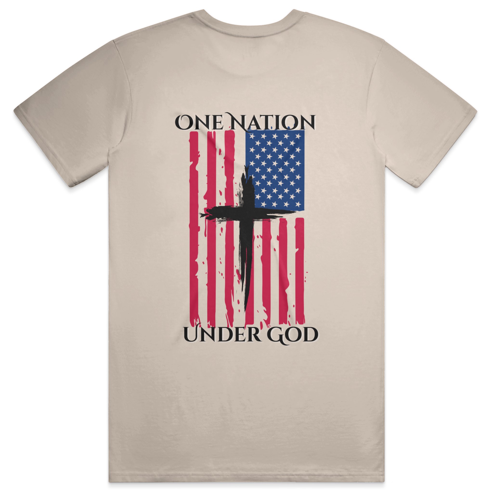 The back features a powerful image of the American flag blended with a white cross and the words “One Nation Under God” — a striking reminder of unity, faith, and freedom. On the front, a simple cross paired with the words “Trust in God” completes the message of devotion and strength.